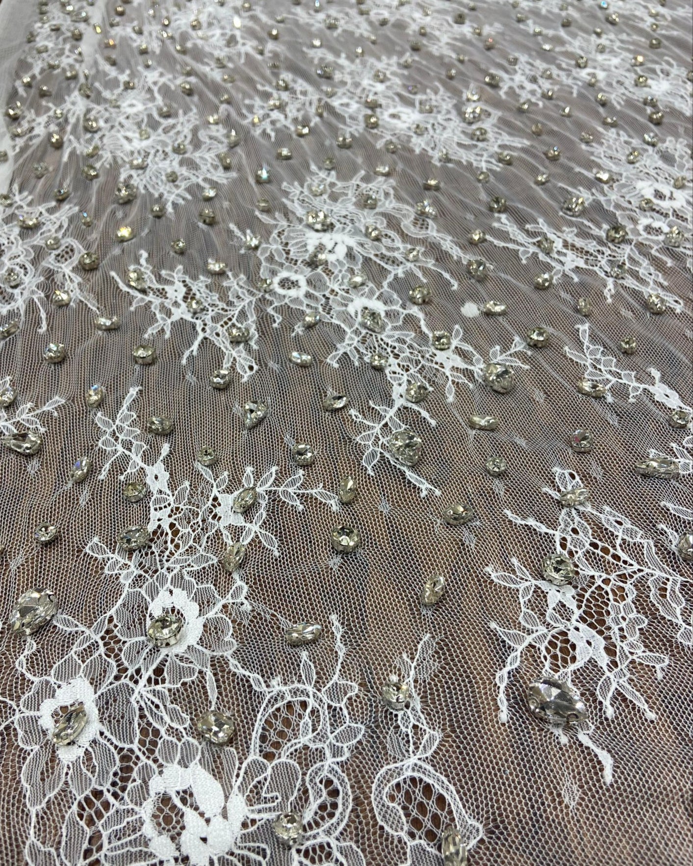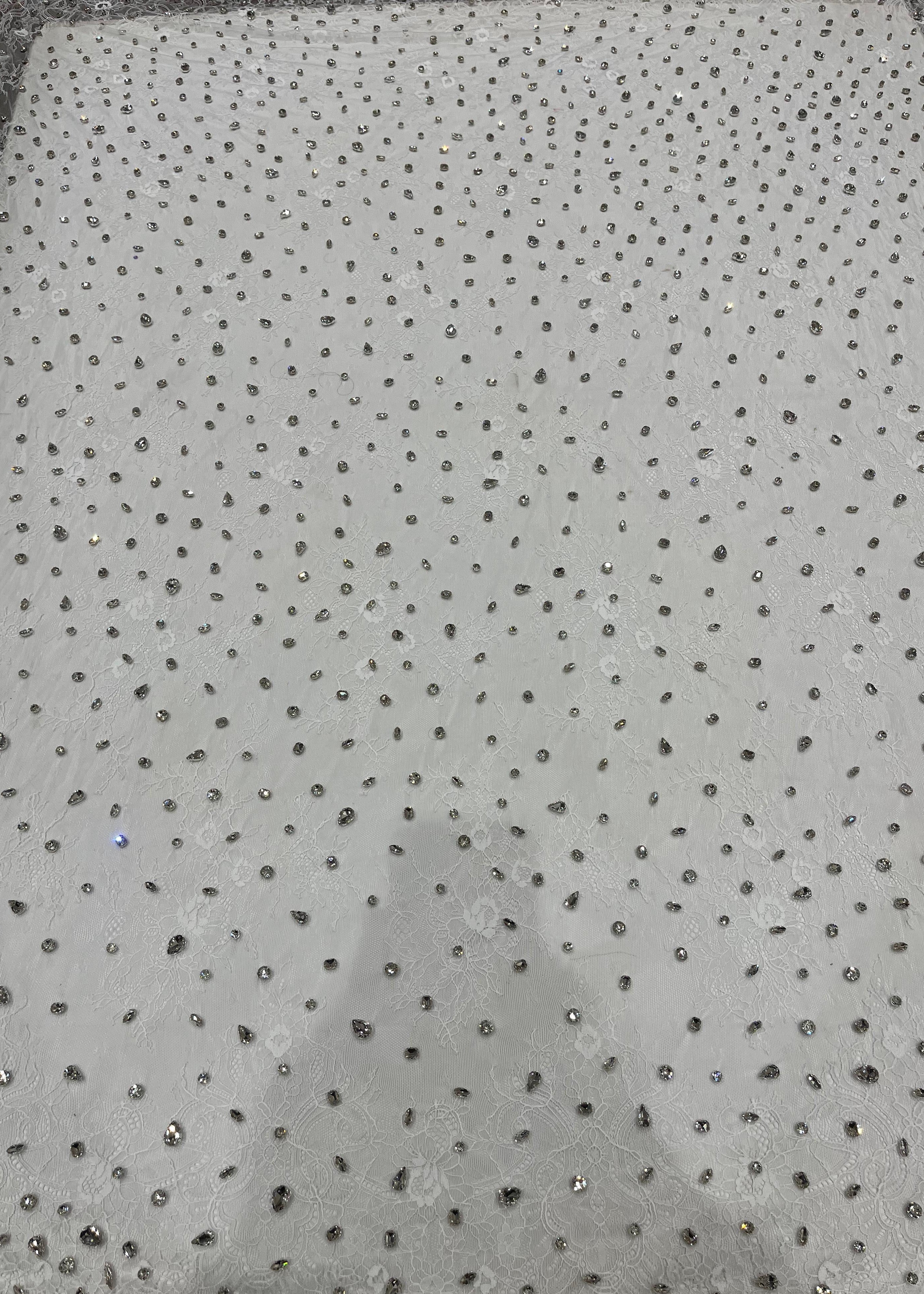 White Tulle Embroidery Fabric with Glass Sew-On Crystals