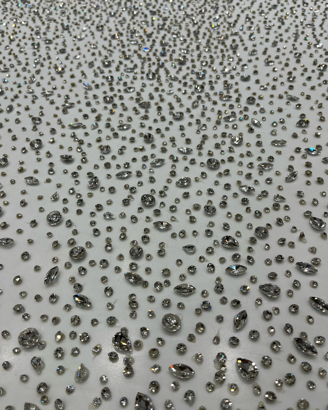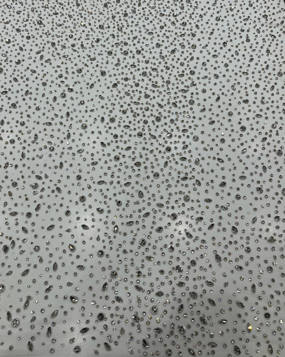 White Tulle Embroidery Fabric with Glass Sew-On Crystals
