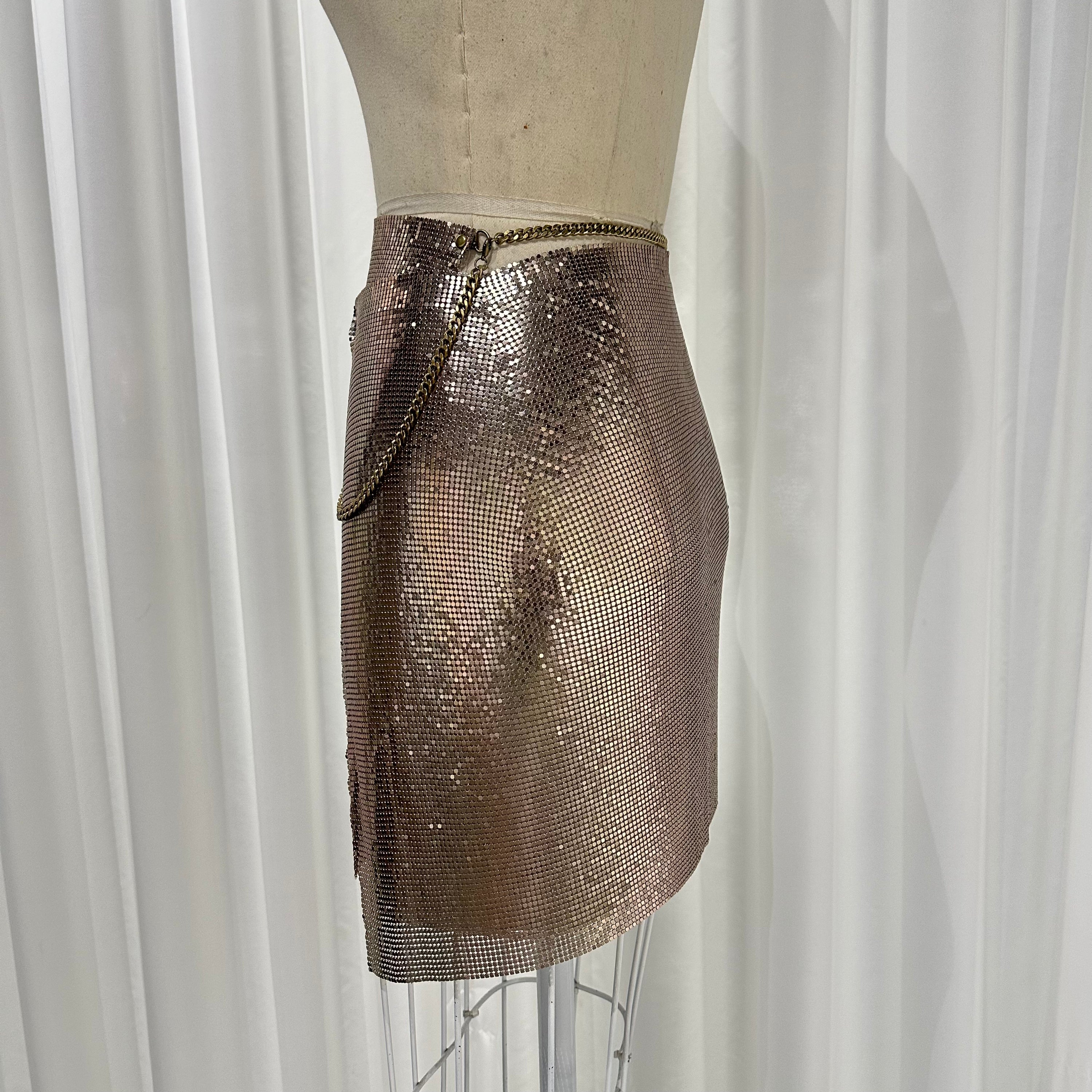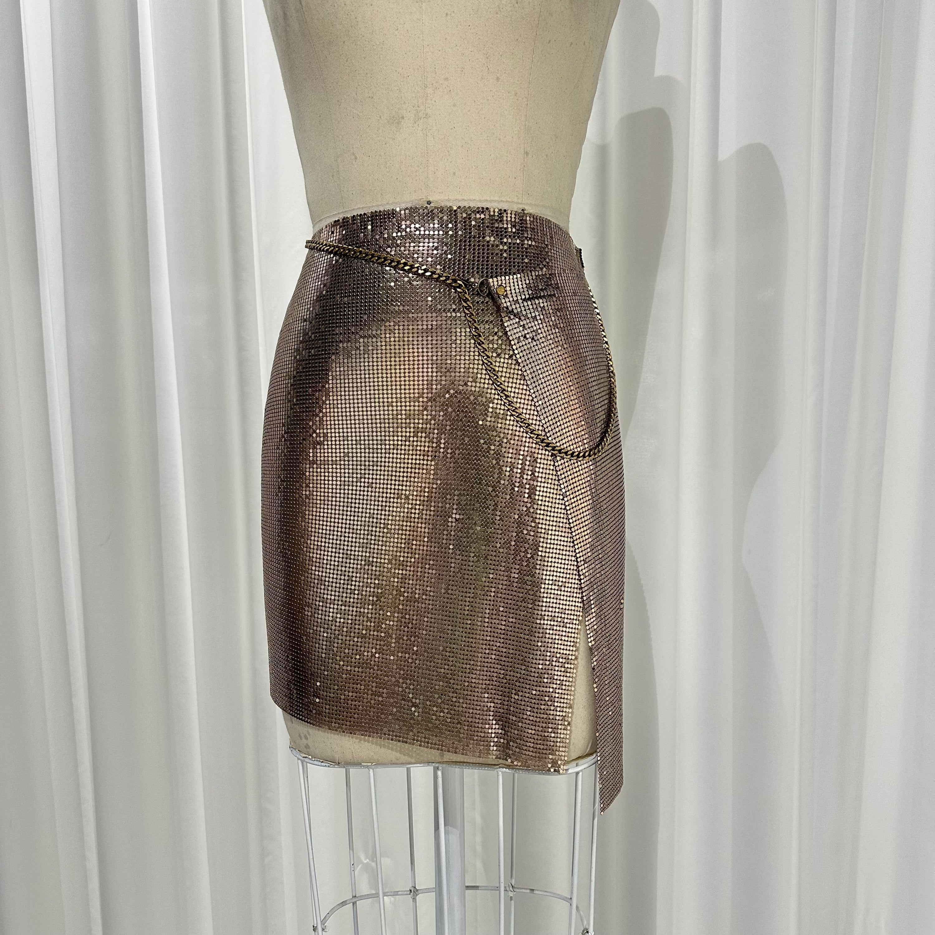 Indulge in edgy elegance with our bronze metal mesh chainmail skirt. This avant-garde piece features a striking chain closure, enhancing both style and fit. Embrace a bold and contemporary look, where the allure of chainmail meets modern fashion seamlessly.