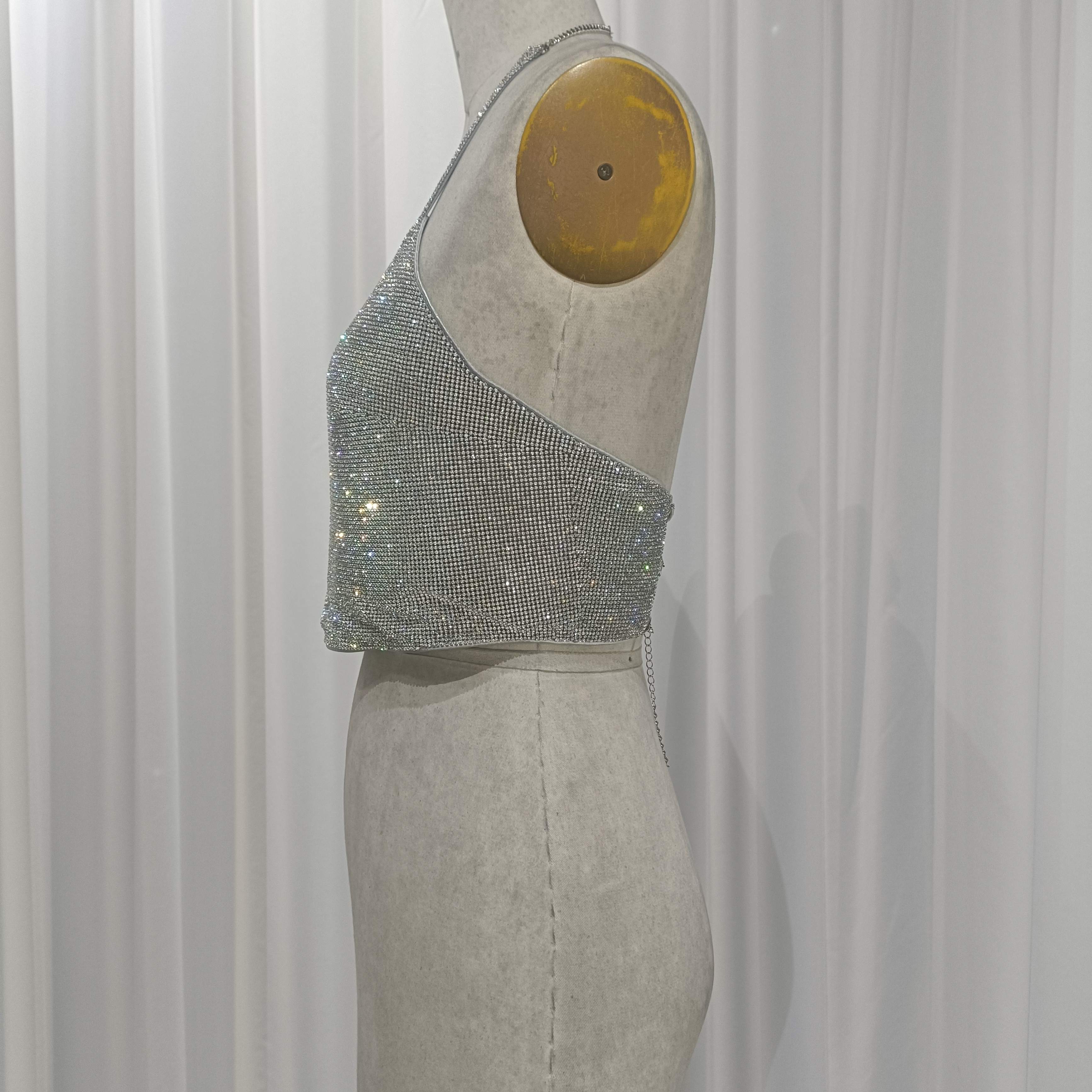 Unleash your inner sparkle with our Silver Crystal Mesh Criss-Cross Back Top. This stunning piece combines the allure of crystal mesh with a bold criss-cross back design, creating a show-stopping look. The silver hue adds a touch of sophistication, making it perfect for both formal events and glamorous nights out.