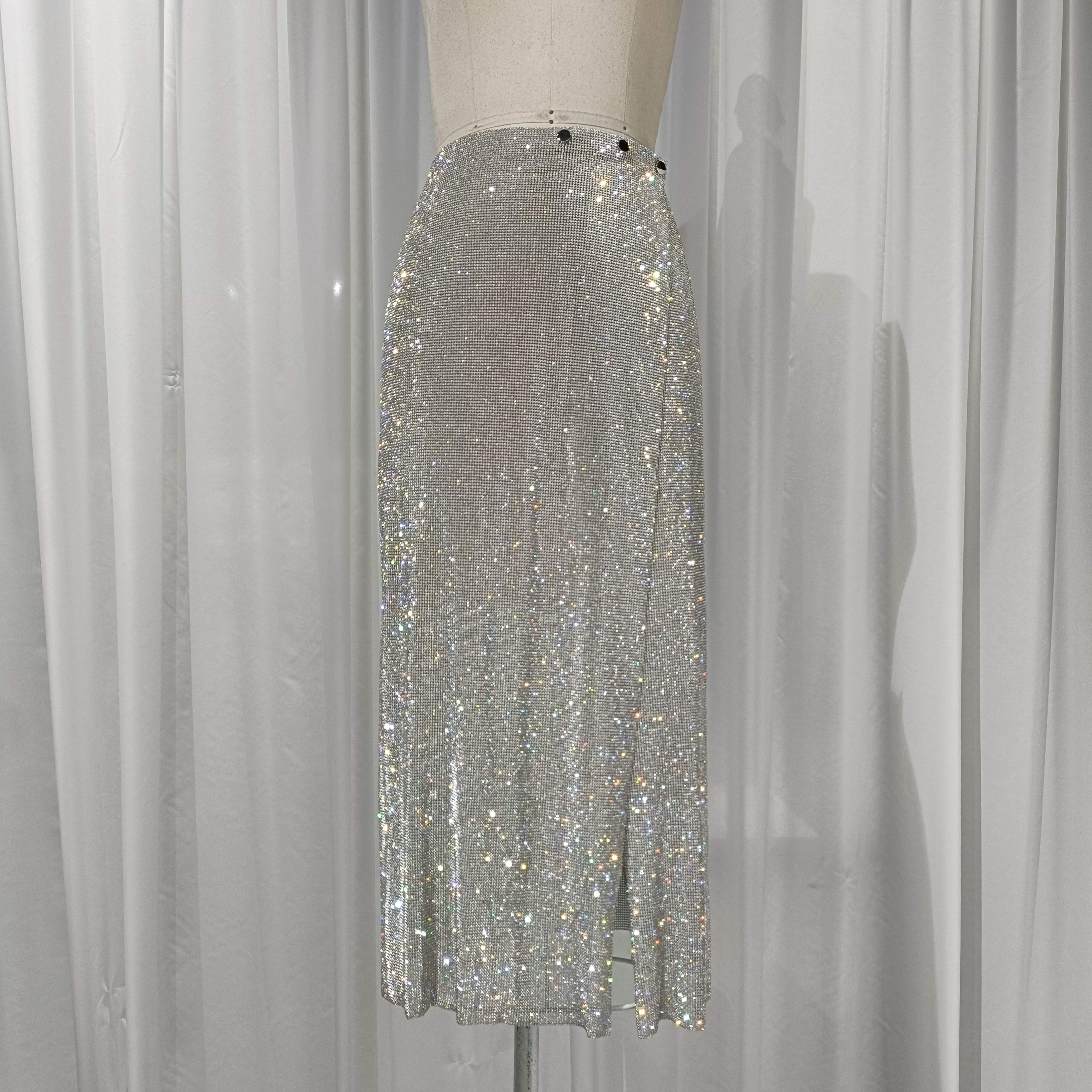 A captivating blend of elegance and modern flair. Immerse yourself in the luxurious shimmer of crystal mesh, adding a touch of glamour to your wardrobe. This midi-length skirt is a versatile statement piece, perfect for both casual chic and upscale occasions. Elevate your style with the enchanting sparkle of crystal mesh, creating a sophisticated look that effortlessly transitions from day to night.