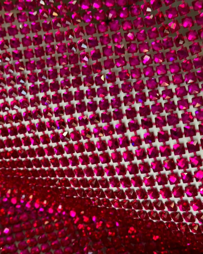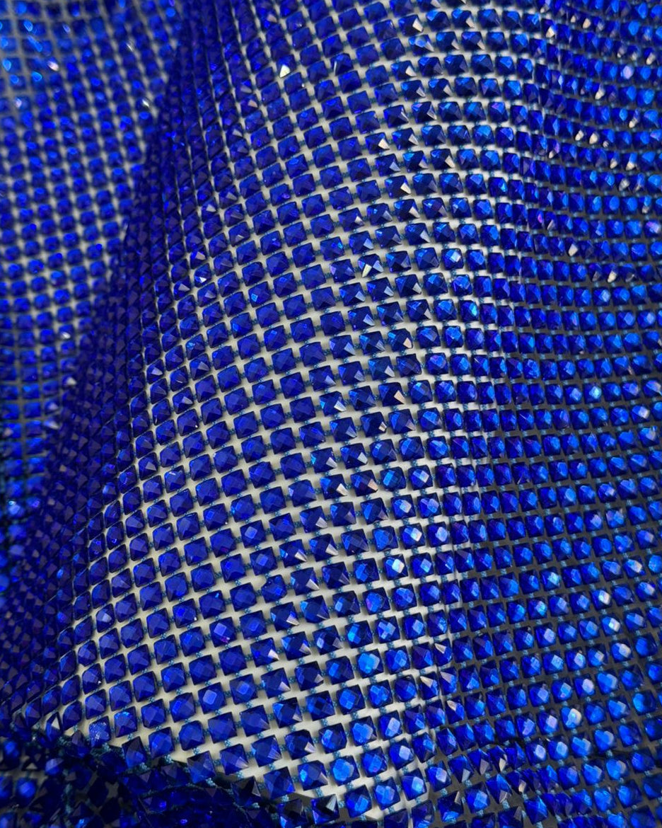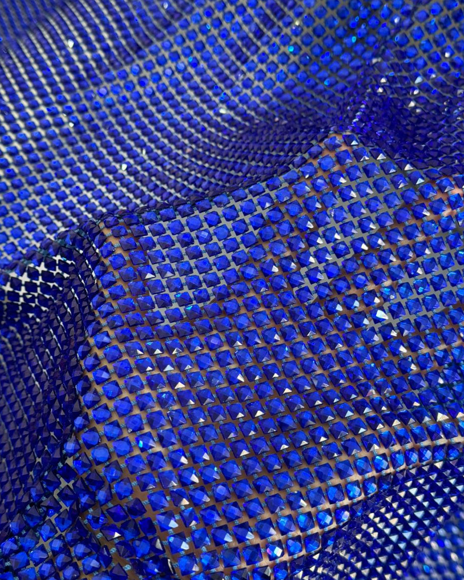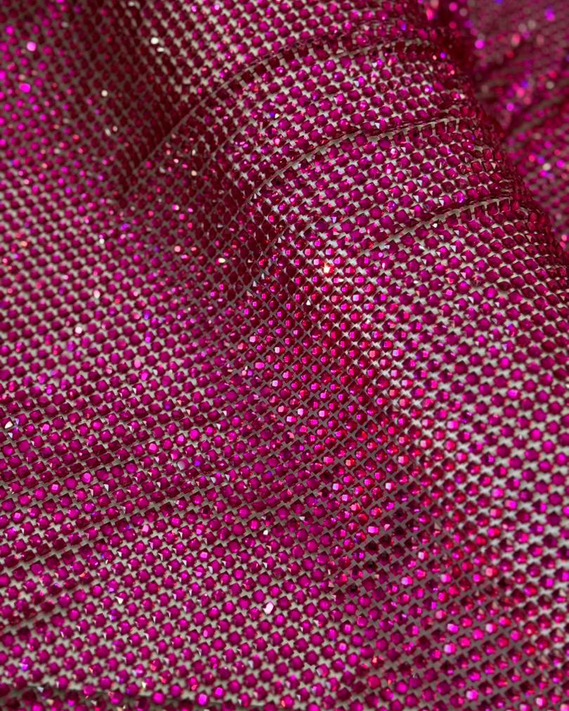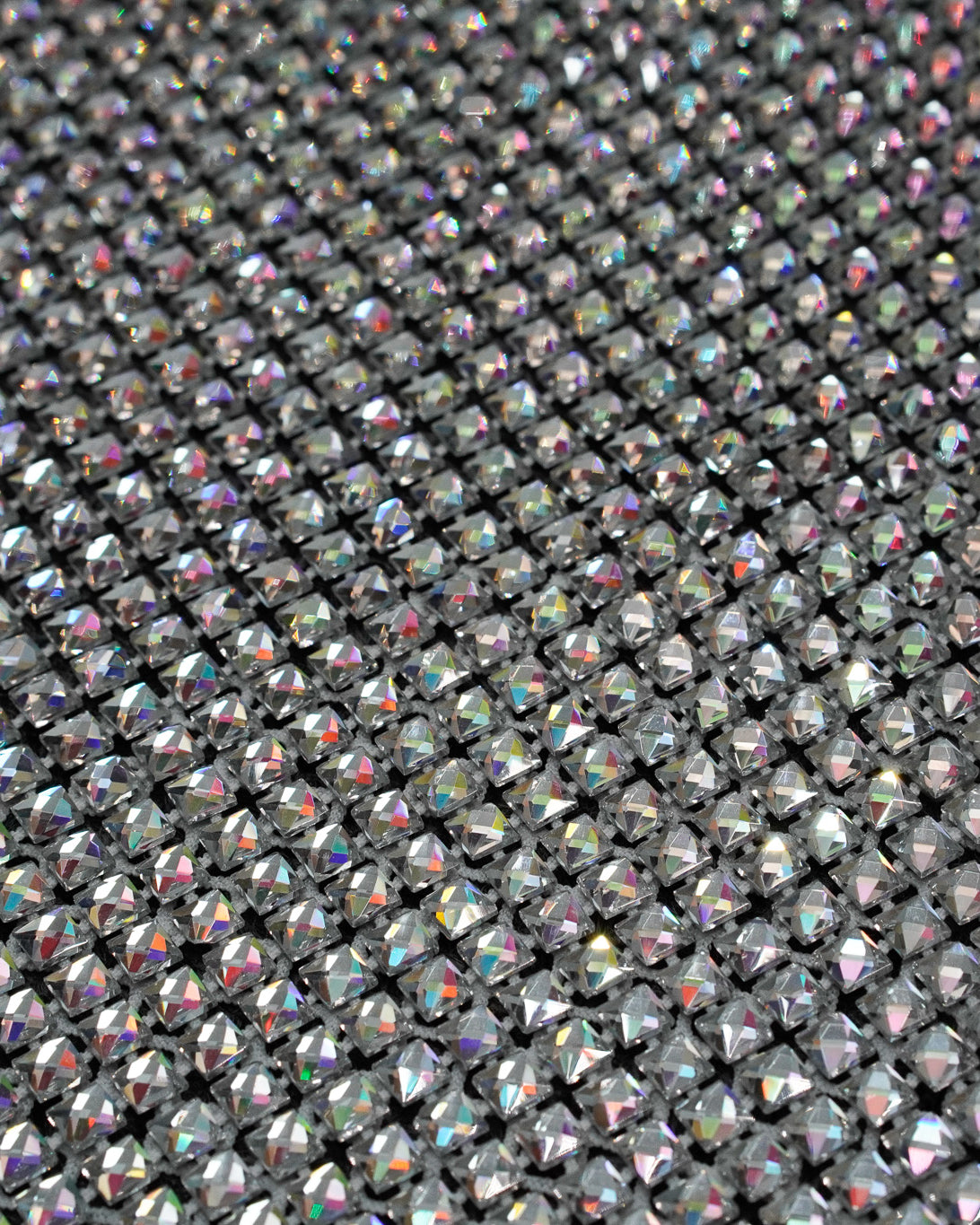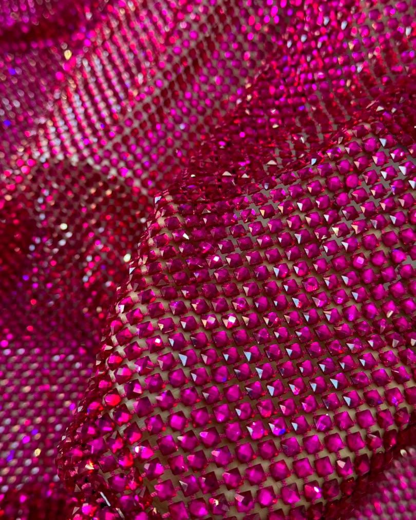 Crystal fishnet fabric with hotfix rhinestones designed for couture, stagewear and high-end fashion designers. This stretch net fabric combines transparency and brilliance, making it ideal for statement garments, performance costumes and eveningwear. Available in multiple crystal sizes, colors and settings.