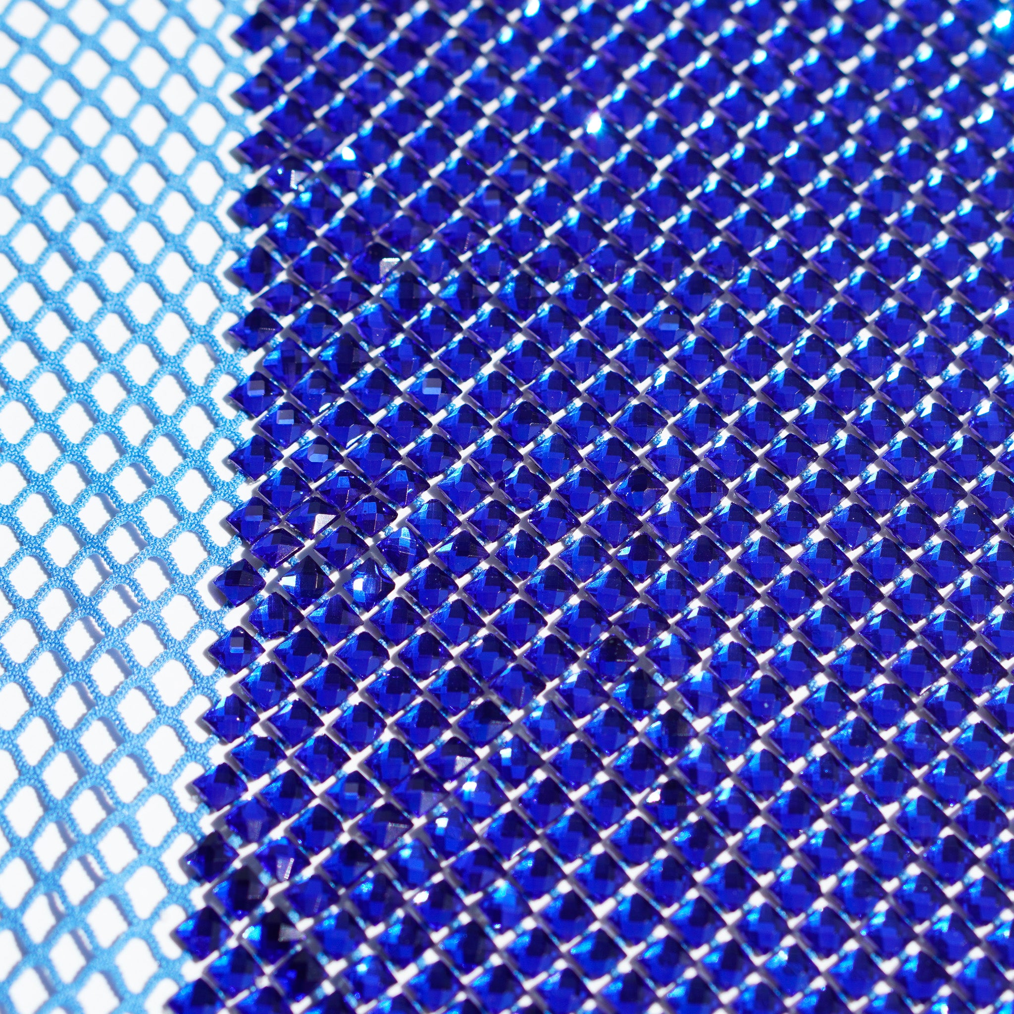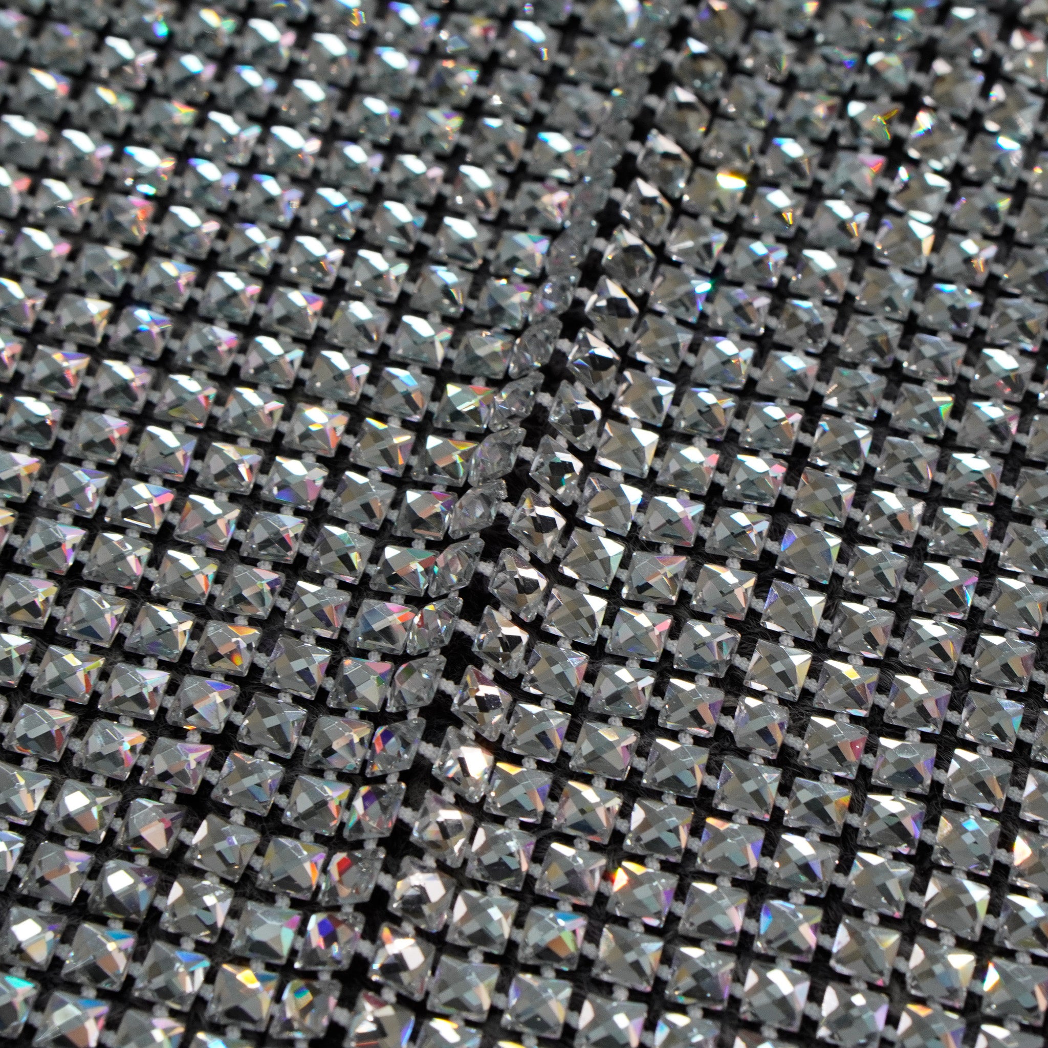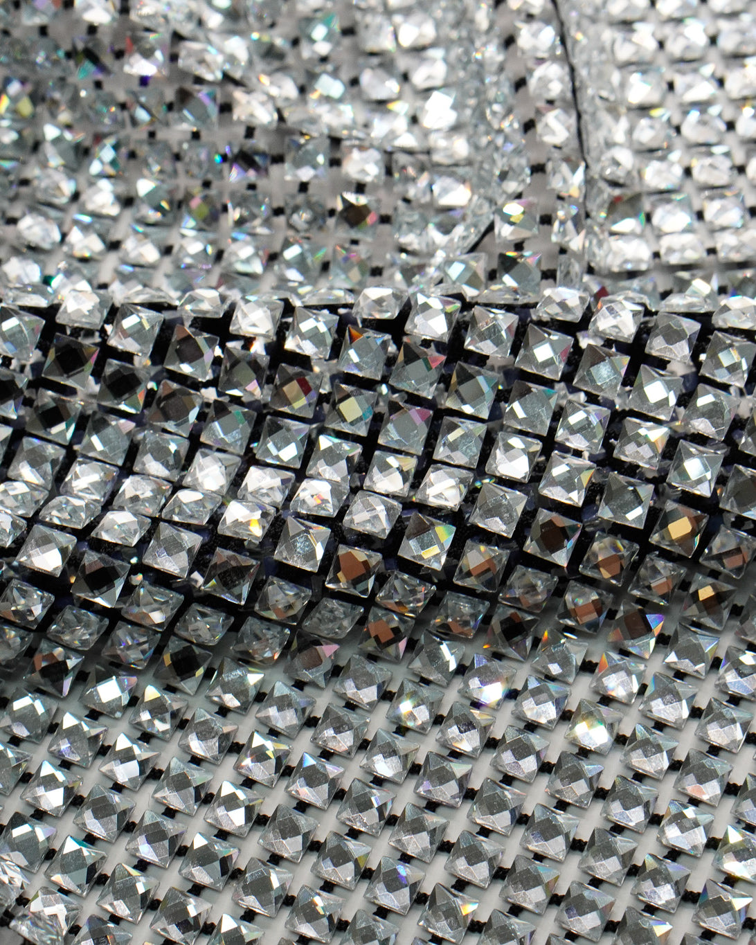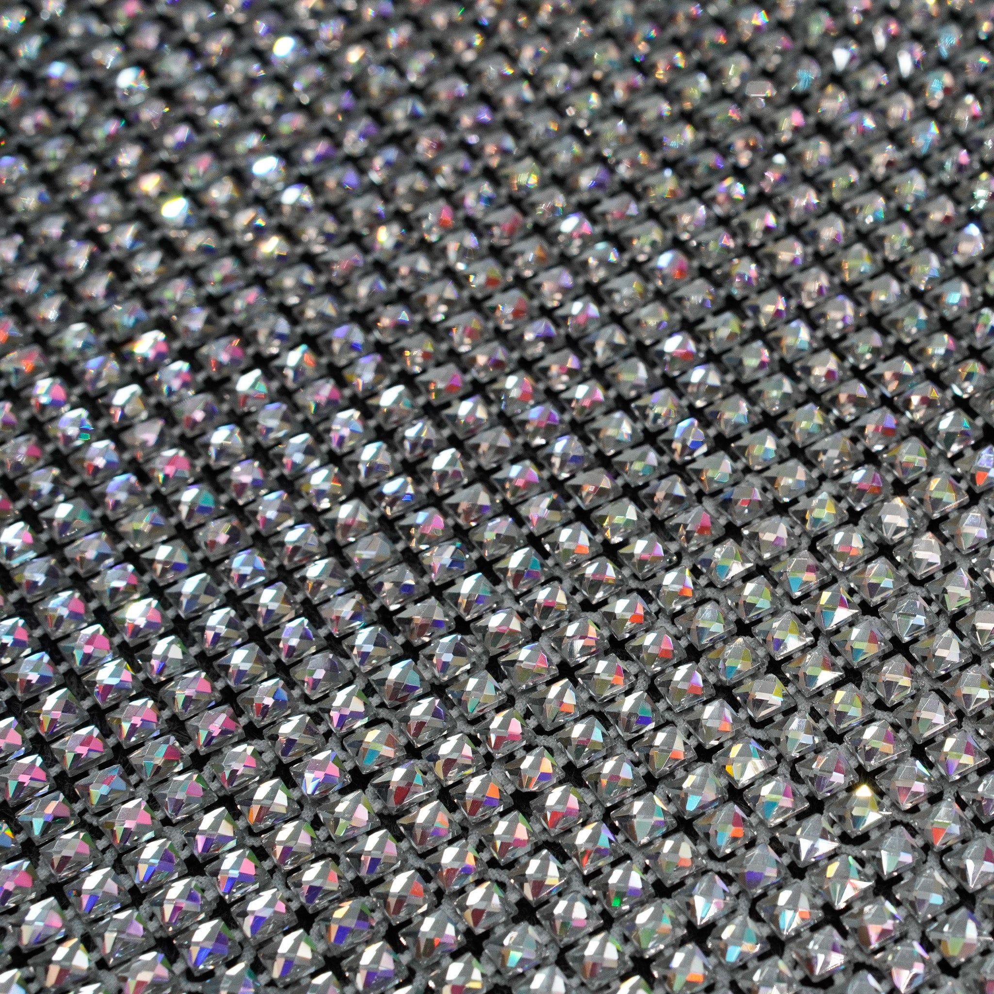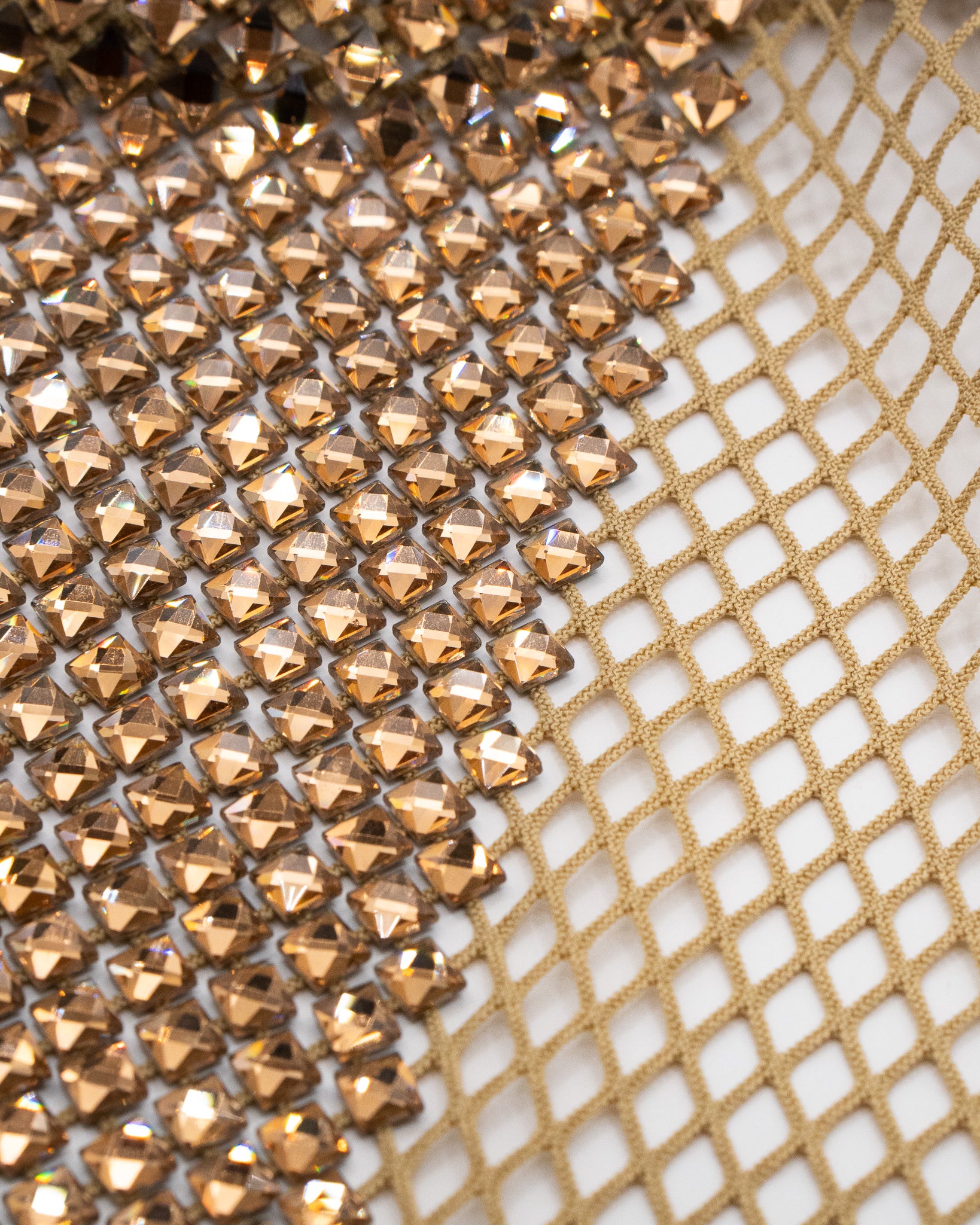 Crystal fishnet fabric with hotfix rhinestones designed for couture, stagewear and high-end fashion designers. This stretch net fabric combines transparency and brilliance, making it ideal for statement garments, performance costumes and eveningwear. Available in multiple crystal sizes, colors and settings.