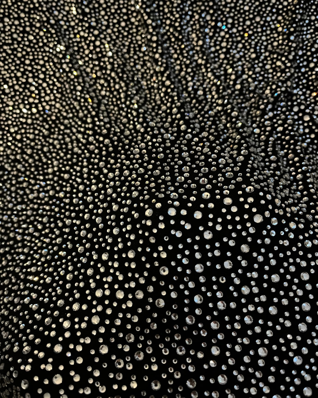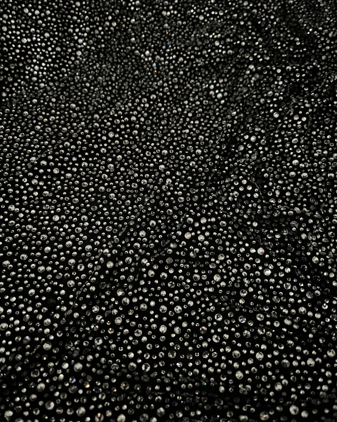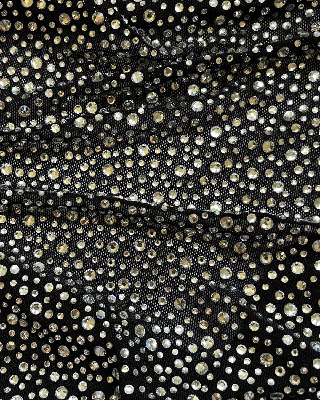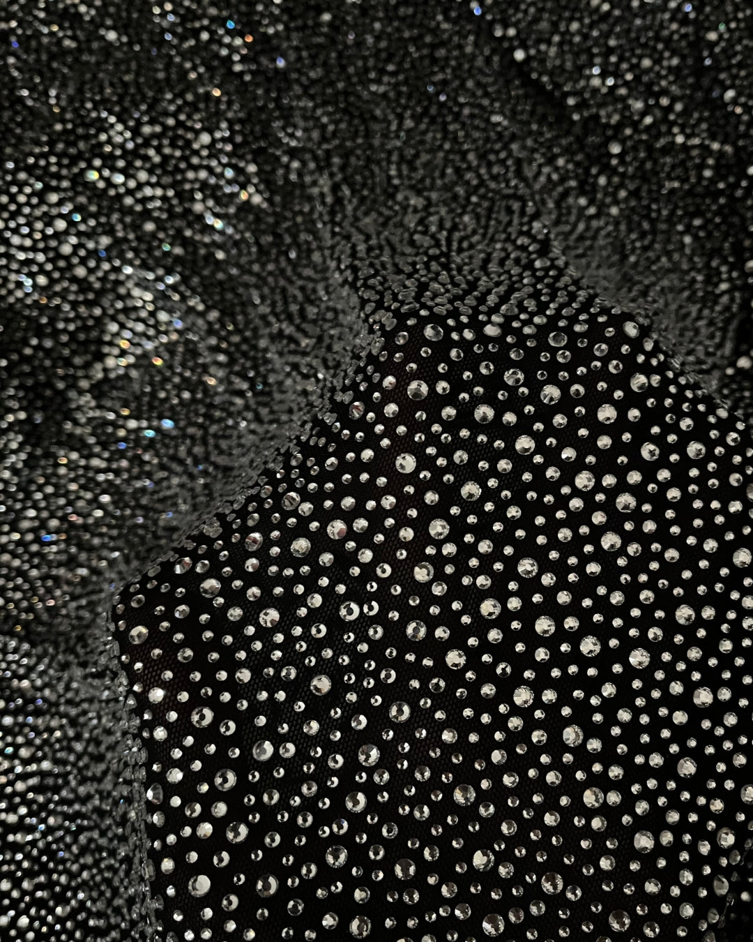 Enhance your designs with our Mixed Crystal Sizes on Black Lycra Fabric. This luxurious fabric features an array of crystals in various sizes meticulously embedded on a sleek, stretchy black Lycra base. Ideal for dancewear, costumes, evening gowns, and special occasion outfits, this fabric offers both dazzling sparkle and high durability. The diverse crystal sizes create a stunning, textured effect, ensuring your creations stand out. Perfect for designers seeking a high-quality, eye-catching material that combines elegance with comfort.