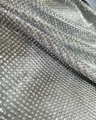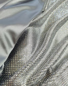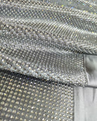 Experience the sophistication of our Silver Crystal-Embellished Pure Gray Silk. This exquisite fabric features meticulously placed silver crystals on a sleek gray silk base, offering a refined and polished look. Perfect for evening wear and high-fashion designs, this fabric combines the luxurious, smooth texture of pure silk with the shimmering allure of crystals. The soft gray silk ensures a comfortable wear, while the sparkling silver crystals add a touch of glamour, making your creations stand out with timeless elegance.