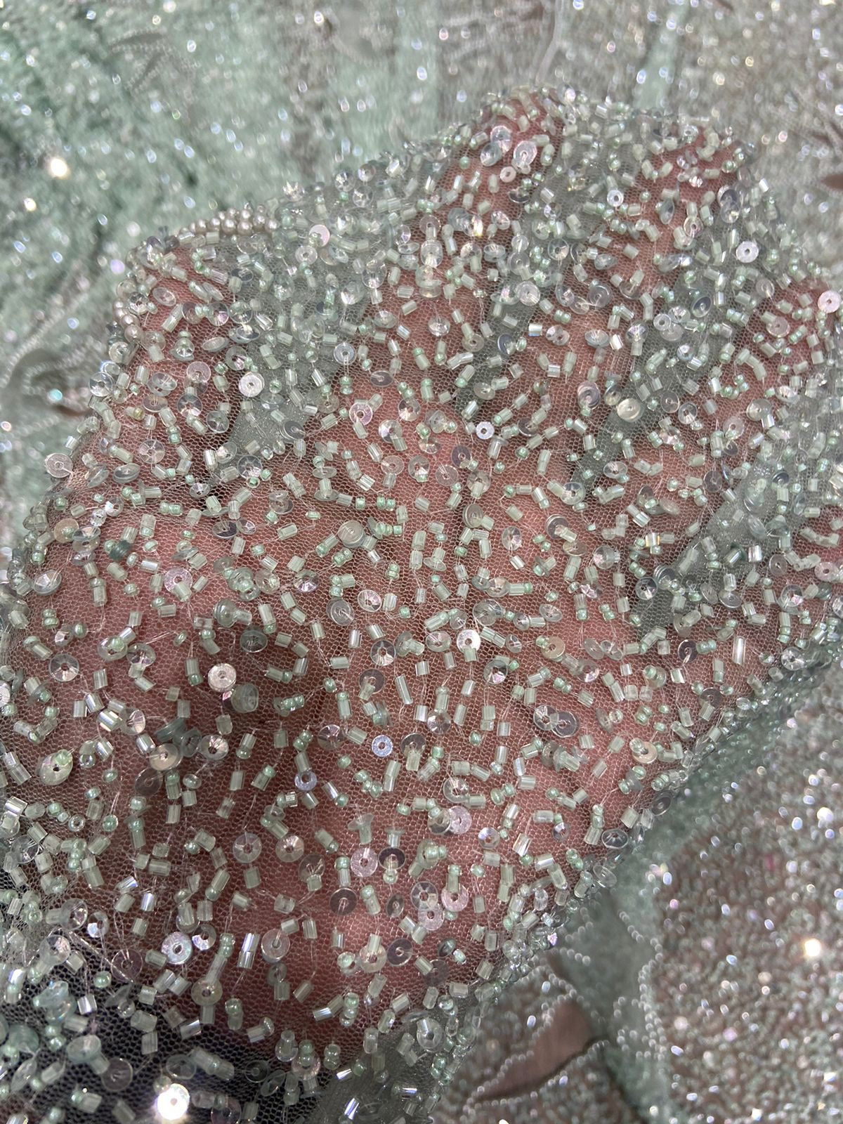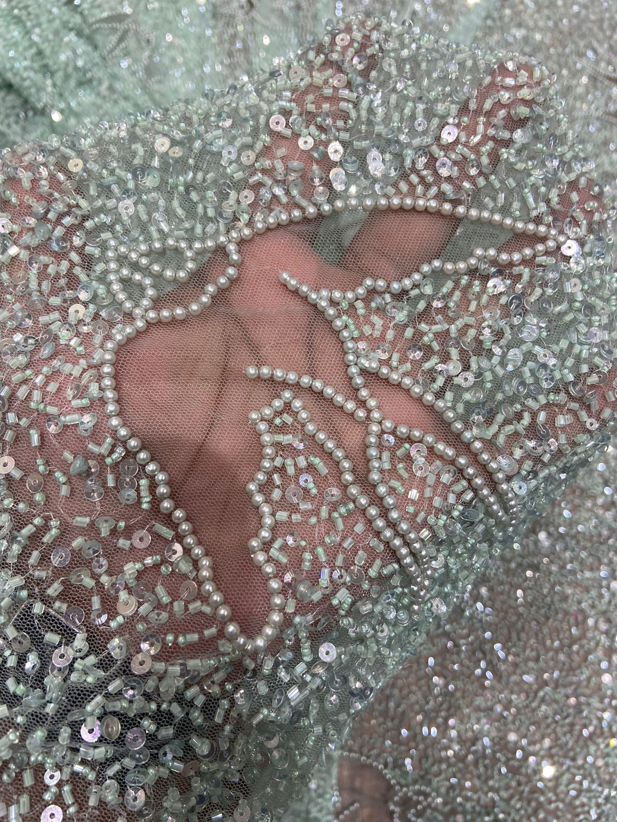 Mint Green Pearl & Sequin Embroidered Tulle
