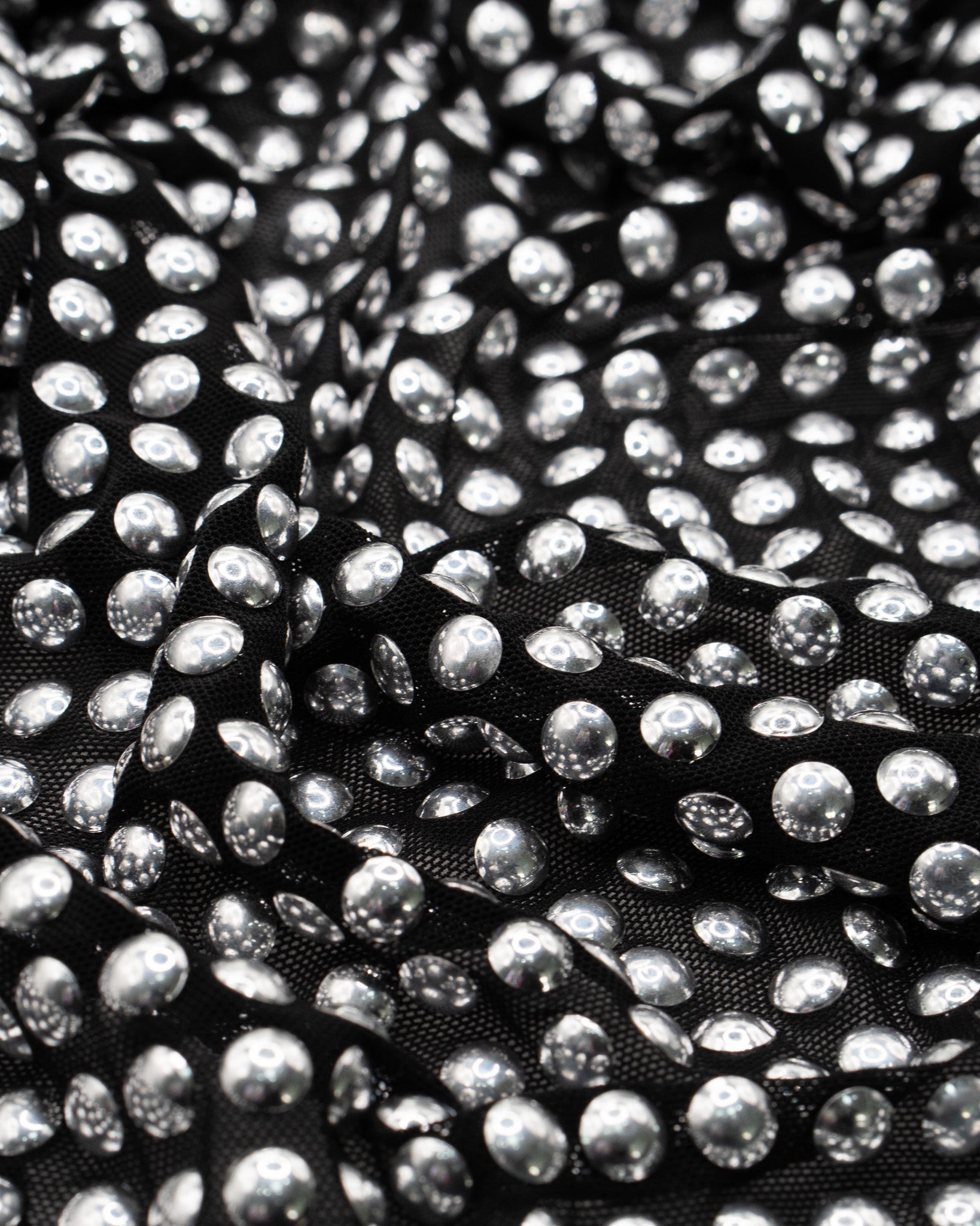 A black stretch power mesh embellished with evenly distributed silver dome studs. The smooth, rounded surface creates a reflective, liquid-like effect while maintaining flexibility and comfort. Ideal for performancewear, evening silhouettes and statement pieces requiring both structure and stretch.